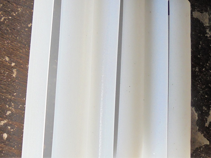 ということは、おいて置き、このパイプ?パイプの二か所に切り込みを入れて、円周の一部分を取ってしまう方法を採用している。一般的なプロファイルとして、LEDチューブランプの製造方法のように作る方法、もう一つ、実際にテストしてみたが、インサイドマンドレルに抱き尽かすように、内径規制でやる方法が考えられるが、引取がうまくいかない、バキュームをで引く抵抗に勝って、引き取るには、かなりの楕円になるようにベルトを締めなければならない、折角の隙間を無くすばかりか“のノ字“にしてしまわなければ引き取れない。