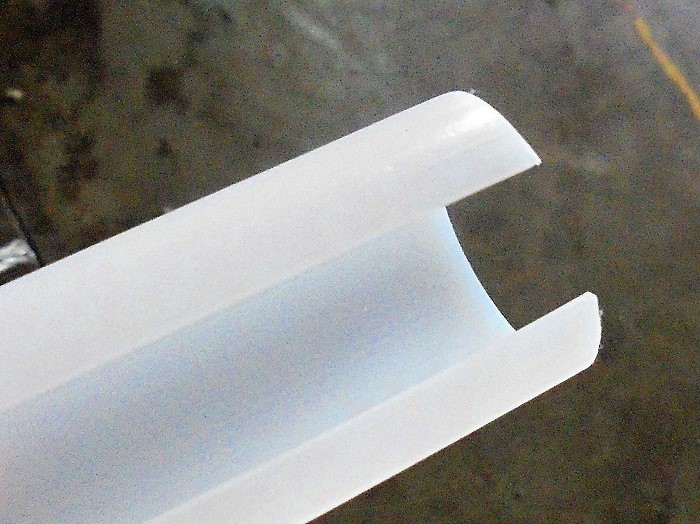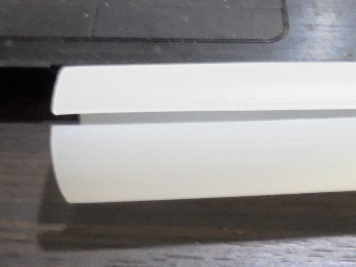 パイプに2mmの隙間を作る件 ようやく見通しがついた。外径30φのパイプに2mm幅を切り取ったパイプ?原料はHDPE、当たり前のことだが、一般的にパイプの長さ方向に切り込みを入れれば、そのパイプが広がることない、閉じる、いわゆる“のノ字”になる。そういうチューブ?は、長物の保護や強化が目的で、何かに巻き付けるという目的でよく使われる、スパイラルチューブと同じ様な目的で、スパイラルチューブのようにいちいち巻き付けるのではなく、はめ込む、挟み込めるので、比較的真っすぐな場所に使われる。それが、巻き付けて開いては拙いわけで、閉じるというのは、目的に合致している。もっとも、開いていた方が挟んで閉じやすいので、開きの反対側に薄い部分を作っておいて開きやすいような製品も求められる、それは、はめ込んだ後、結束バンドなどで、何か所か縛る。
