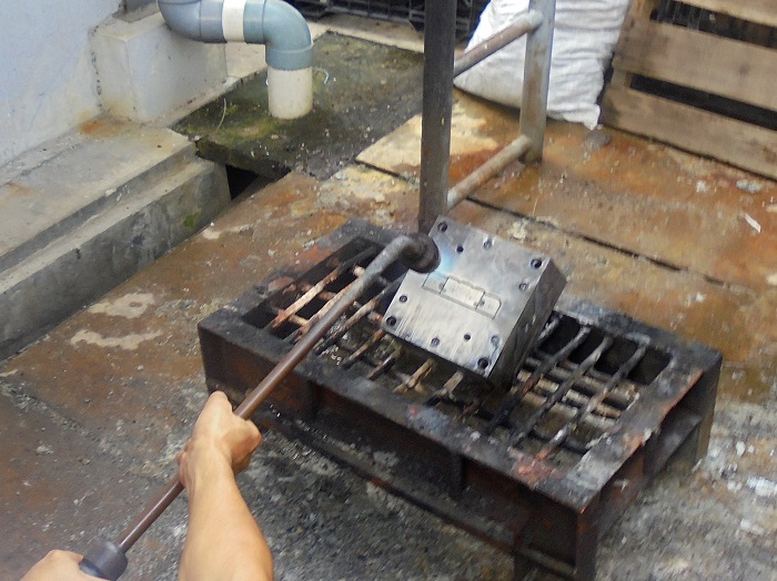 焼き場で金型を焼くというより、樹脂を溶かして金型から離す。55年間、同じ方法です。樹脂の話し方も上手下手がある。これにも、コツがある。とにかく、金型を焼けばいいというものではない。電気炉やガス炉で樹脂を綺麗になくす方法もあるが、一晩,余裕がある時しか使わなかった。停電になれば、大活躍になる。