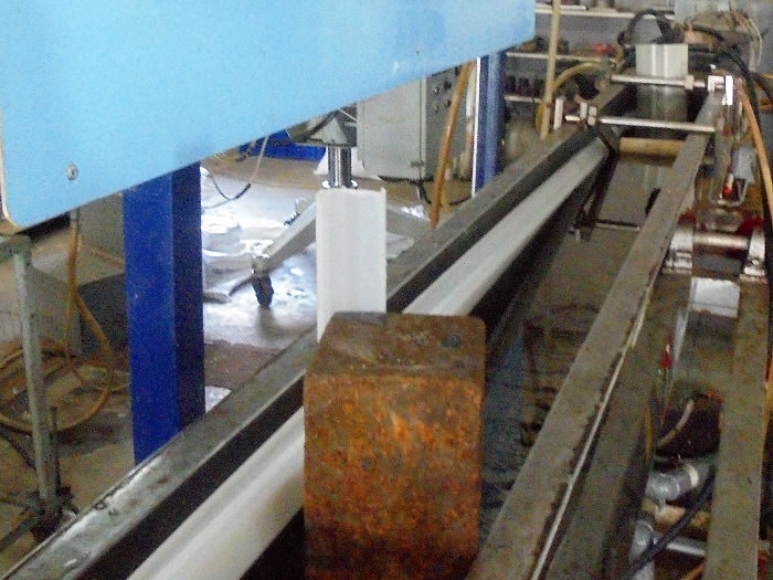 製品の断面寸法は、公差内に入っているから、一応、OKだが、ぎりぎりだと思われる場合は、冷却金型を修正するか、溶融金型を修正しるか迷うが、直ちにどちらかに決める、勘で。幅を修正する方が、修正%が少なくて済むので、冷却金型の内幅を広くしたり、狭くしたりする方を選ぶ。もう一つ、製品が上か下に反っている、或いは、左右に曲がっている、左右に厚さの違い、金型内の冷却温度の違い、その後の水槽に中での冷却速度の違いが原因だ。公差に入っているが、製品そのものの肉厚の微妙な違いを修正するか、物理的に水槽に中で、逆方向の曲げて治す。写真のこの製品は、水槽の中だが、上に持ち上げて上に反らせ、水からだしてしまっているす、向こう側にも曲げている。これで、真っ直ぐになるのです。程度は、結果を見ながらの勘ですね。