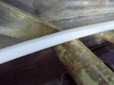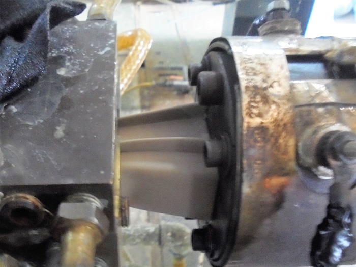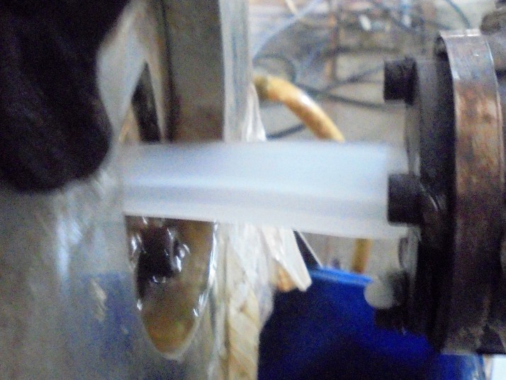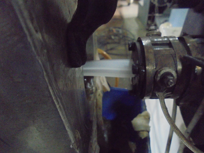 製品の大きさに合わせて、閉め過ぎないように、緩めすぎないように、引取機の締め具合を常に気にしながらの作業になるが、引取速度をそなままに、スクリュー回転を徐々に上げて、冷却金型の入り口をほとんど塞ぐようにしがら、水槽を口金に近づけてゆく、既に、製品形状か求める形状に近くなっている。そして、冷却金型を溶融樹脂が塞ぐように、密着させる。製品の表面はどうか、筋や凸凹はどうか、つやはどうか、外回り全体が、同じ力で密着していなければならない。エアーギャップを調整しても、密着強さが違うなら、口金を修正しなければならない。ここでも、勘が必要。一旦停止だ。