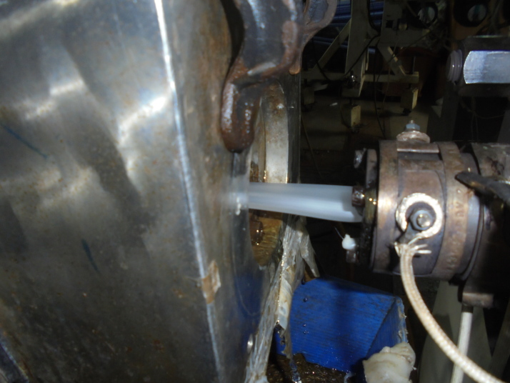 次に、その樹脂を掴んで、冷却金型に通し、引取機まで持ってゆく。引取速度も勘で設定しておく。HDPEの場合、これが難しい、溶融樹脂が素直に伸びないからだ。掴んだ温度感覚が200℃前後の設定にしては熱く感じるからだ。一人で、3M位離れた引取機まで持ってゆくことができれば、このことに関しては一人前だ。普通は、二人でこの作業はする。
